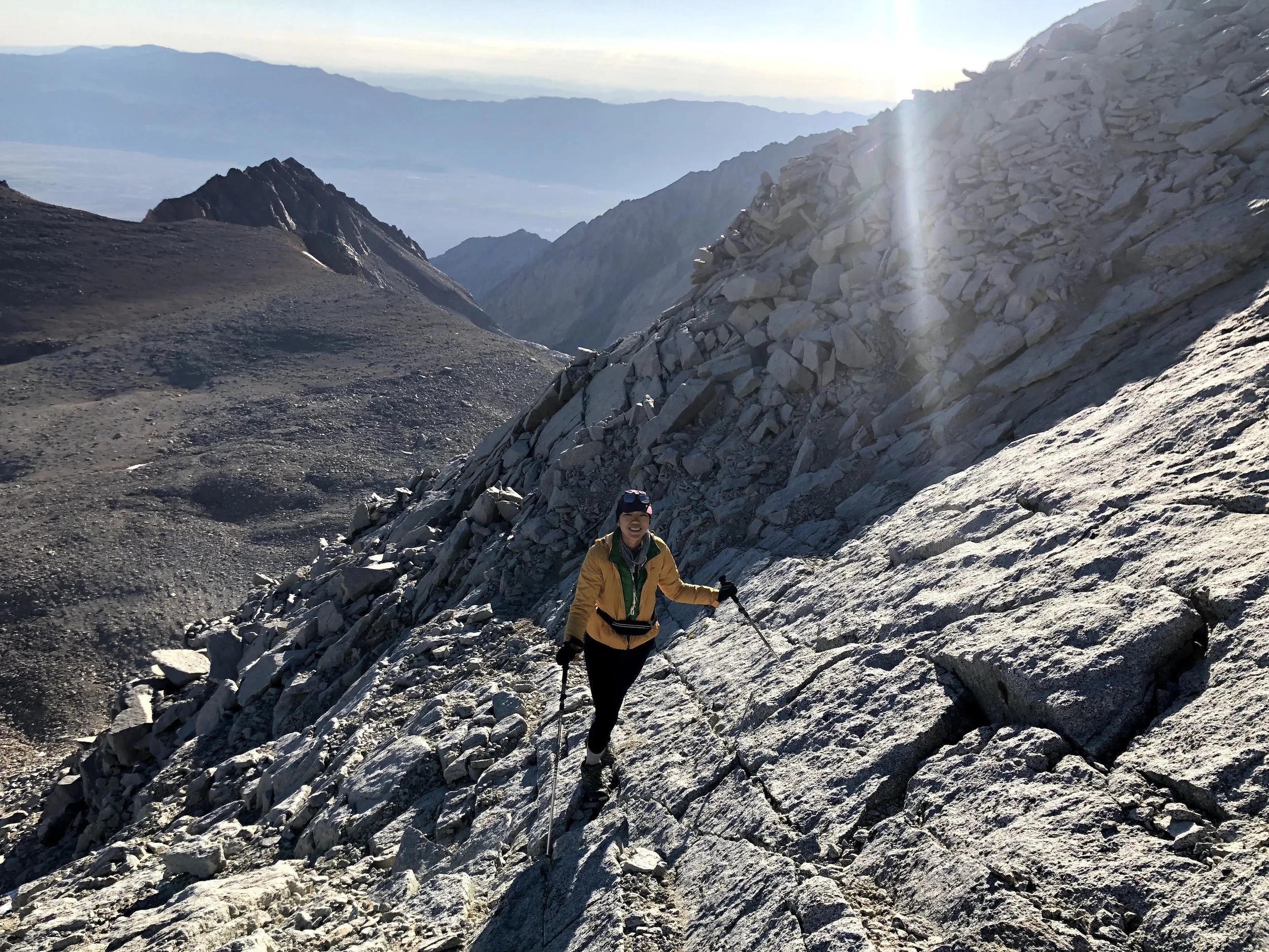 Chimneys and ledges: Most parties follow a series of chimneys and ledges trending up and slightly left. The rock is generally solid compared to other Sierra peaks, but expect some loose blocks.